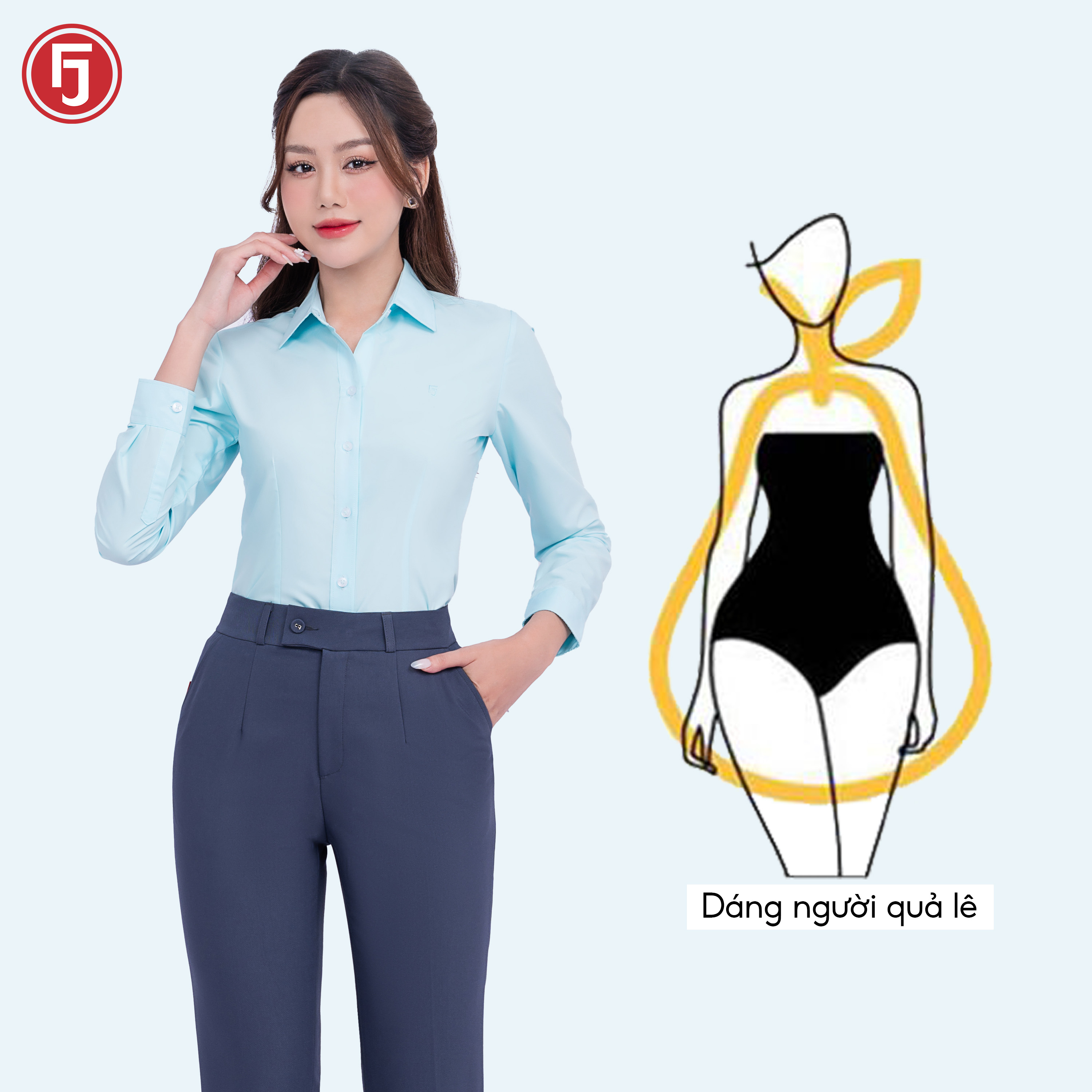 Dáng người quả táo: Với người có bờ vai rộng, đầy nhưng phần thân dưới lại nhỏ và chân ngắn thì một chiếc quần ôm đùi và ống suông sẽ giúp bạn lấy lại sự cân đối cho cơ thể.