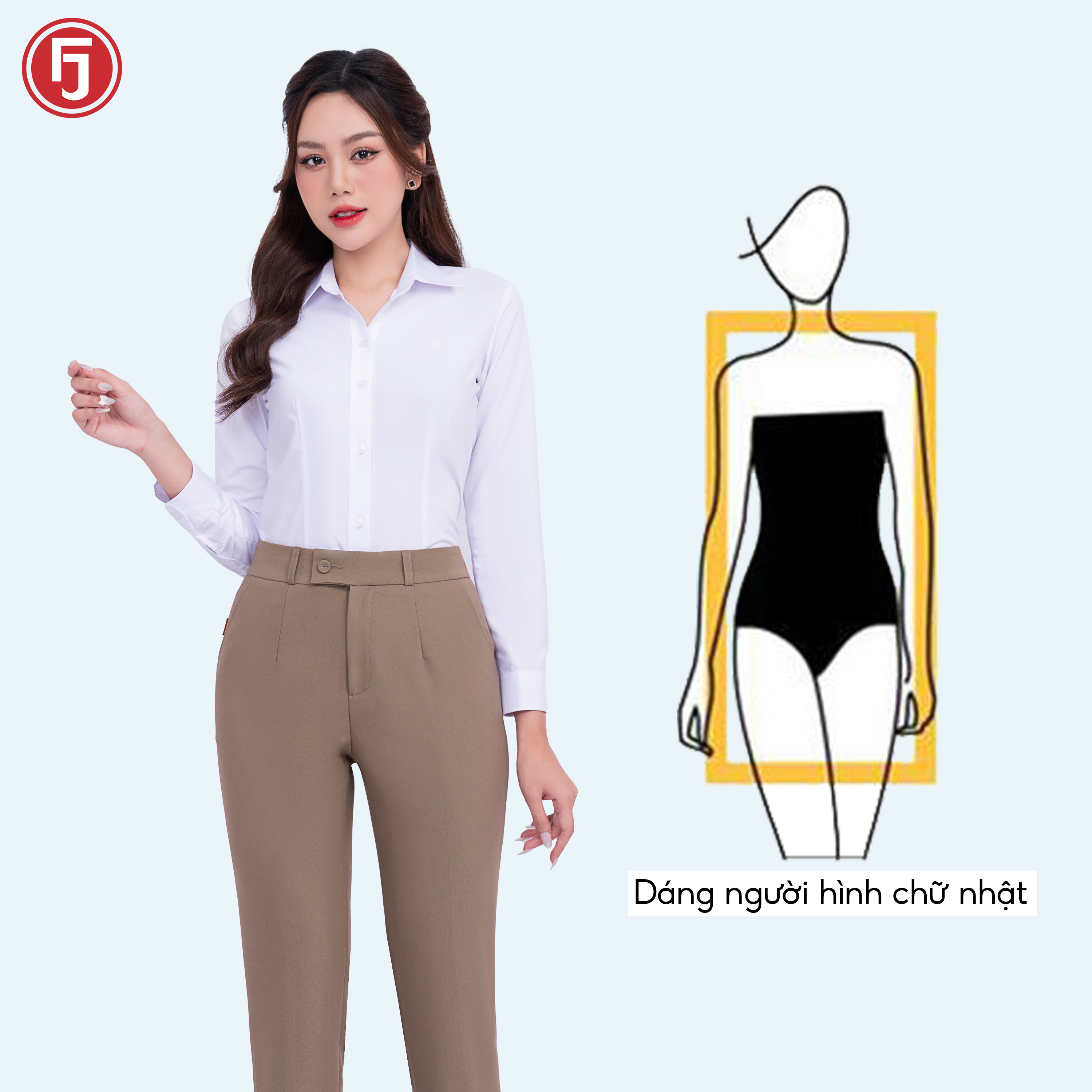 Dáng người dình chữ nhật: Hãy làm dài đôi chân bằng một chiếc quần ống suông dài qua mắt cá chân. Nên kết hợp kiểu quần này với giầy cao gót để chiều dài của quần phủ xuống đôi giầy một chút.