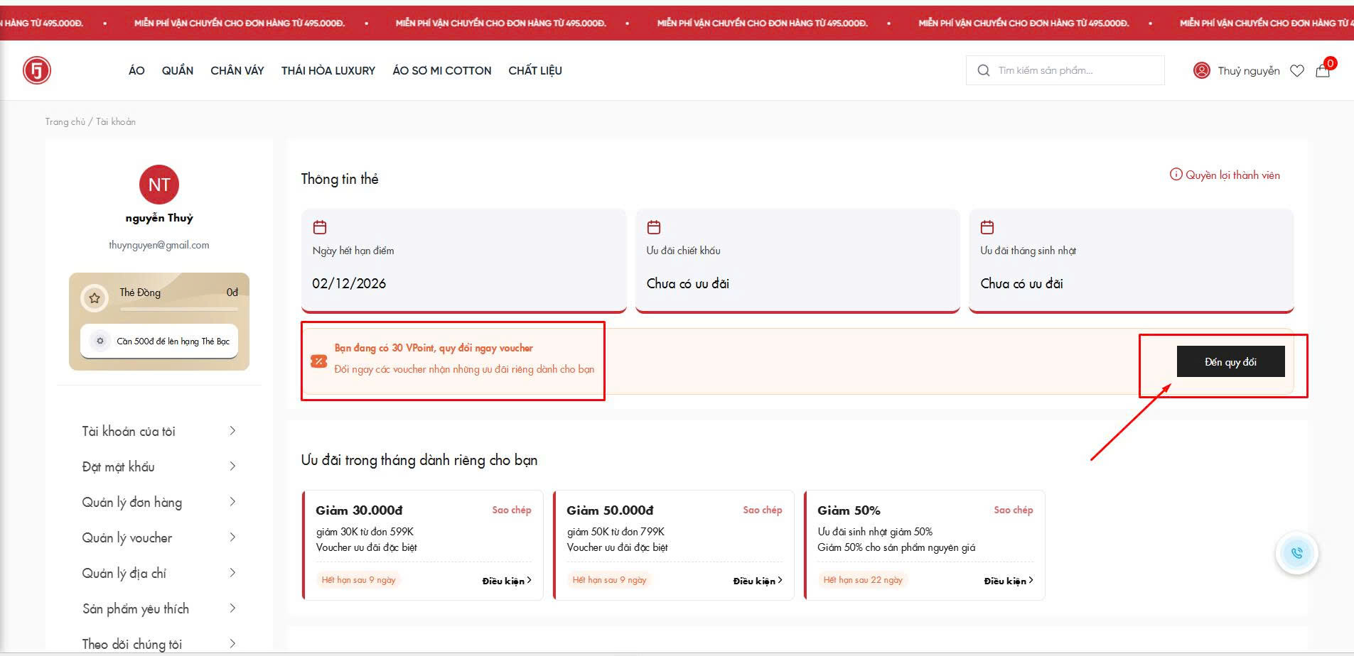 Hệ thống sẽ trừ 30 VPoint và cộng voucher vào tài khoản ngay lập tức.