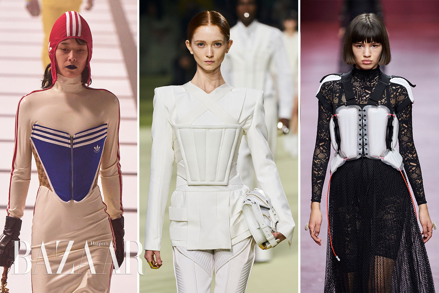 Phong cách corset phổ biến vào thế kỷ 16, 17 nhưng đến thế kỷ 20, corset hứng chịu làn sóng tẩy chay lớn, người ta ủng hộ việc giải phóng cơ thể phái nữ khỏi những chiếc nịt ngực bức bối. Đến nay, sau khi bộ phim Bridgerton công chiếu, những corset đã dần quay trở lại. Từ trái sang: Gucci x Adidas, Balmain, Christian Dior. Ảnh: ImaxTree