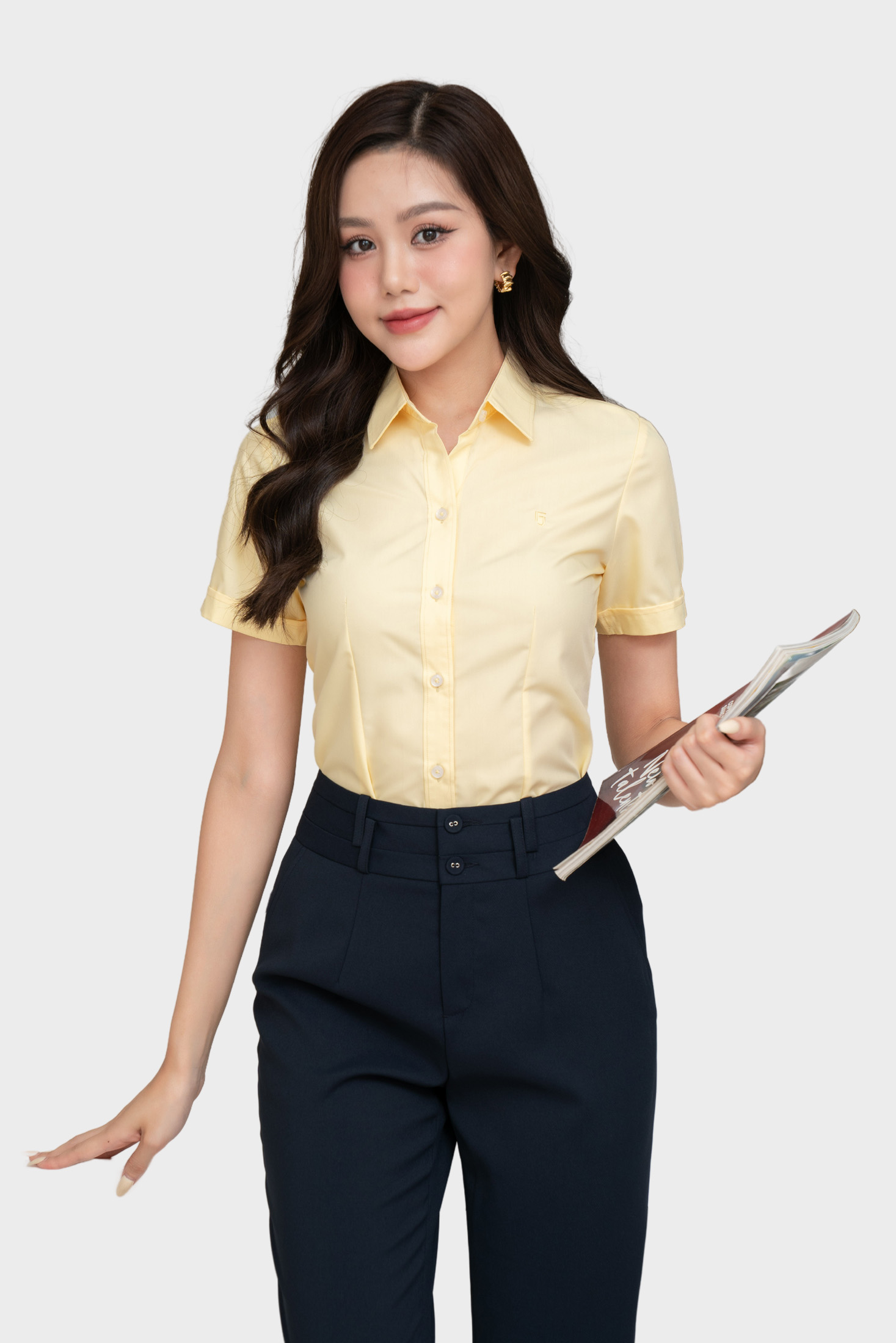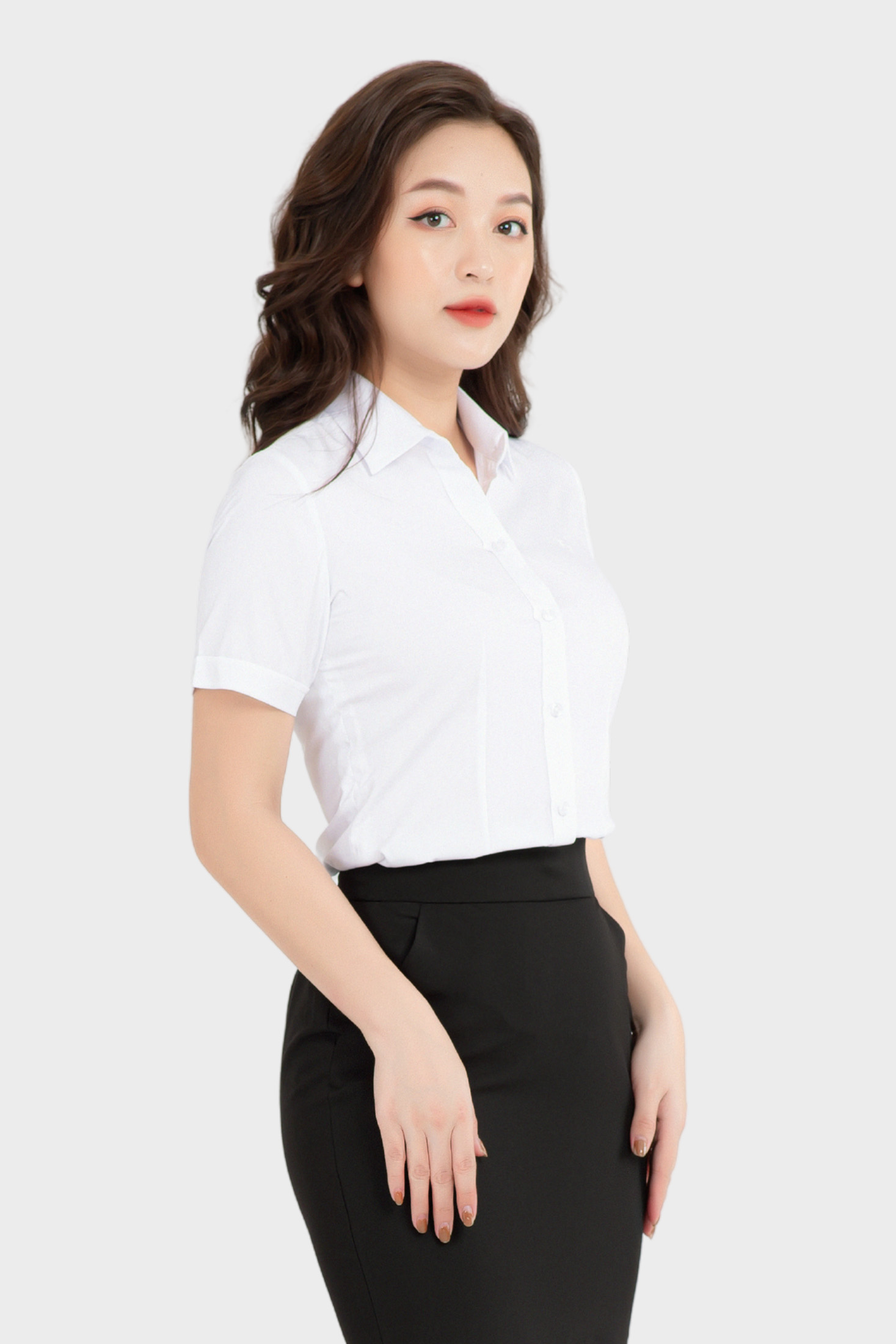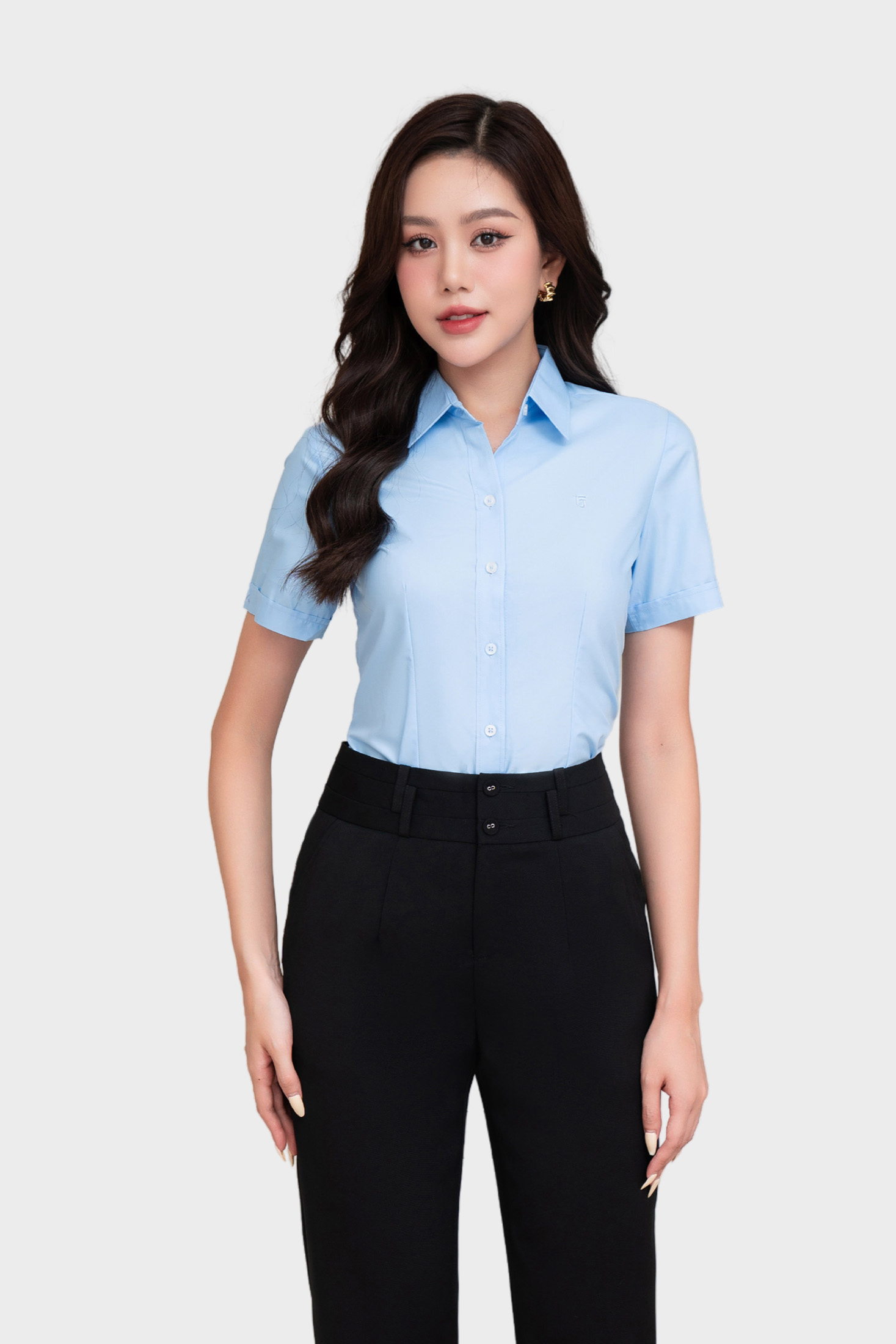 Áo sơ mi nữ 24ASW-246 ngắn tay sợi cotton phối poly vải trơn cao cấp nẹp khuy chiết ly eo Thái Hòa