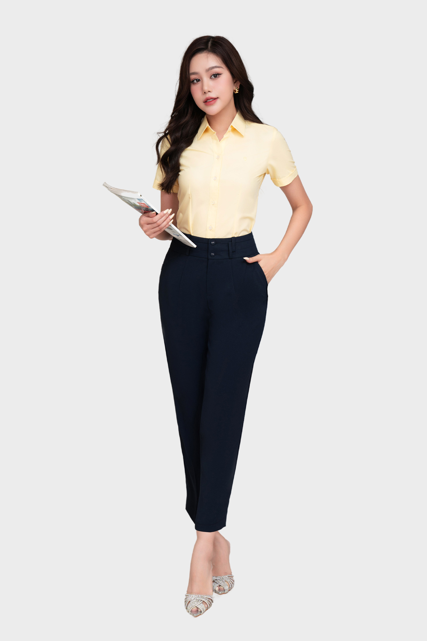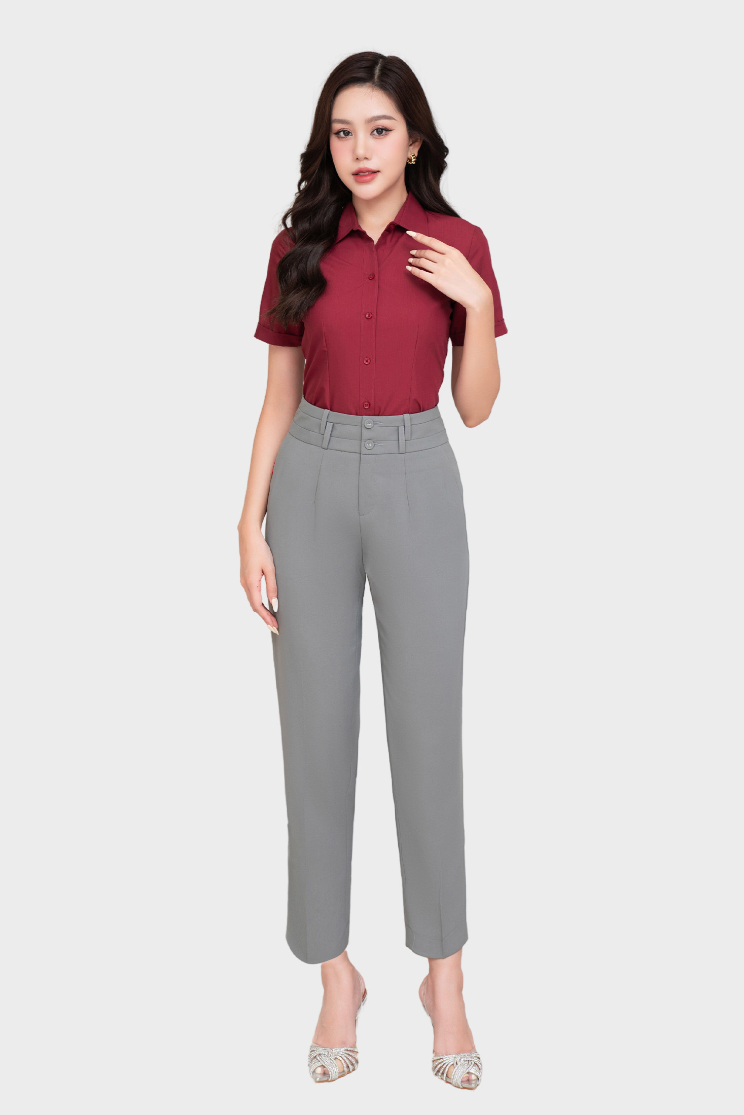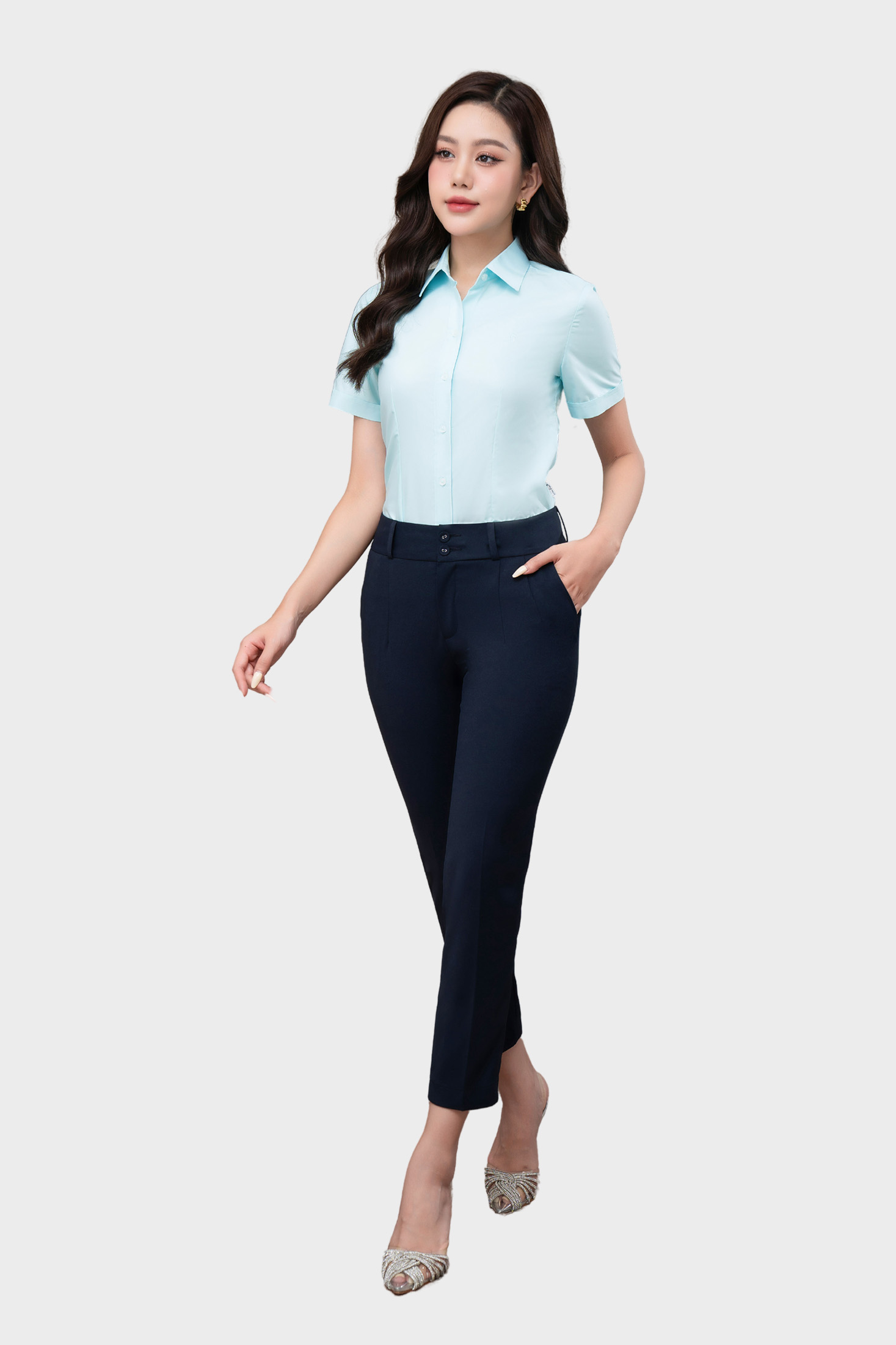 Áo sơ mi nữ 24ASW-246 ngắn tay sợi cotton phối poly vải trơn cao cấp nẹp khuy chiết ly eo Thái Hòa
