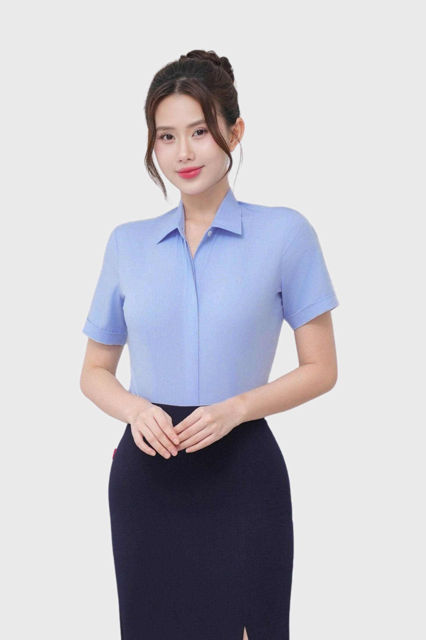 Áo sơ mi nữ 24ASW-246 ngắn tay sợi cotton phối poly vải trơn cao cấp nẹp khuy chiết ly eo Thái Hòa